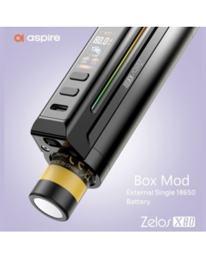 La box Aspire Zelos X80 est un mod électronique compact et puissant fonctionnant avec un accu 18650 (vendu séparément). Elle délivre jusqu’à 80W et propose plusieurs modes (VW, VV, TC, Bypass, CPS) pour une vape entièrement personnalisable.